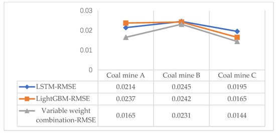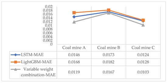 It can be observed from Figure 7 that the prediction error of the modified variable weight combination model is smaller than that of the conventional model, and the increase in Mine A is the most obvious. MAE value increased by 18.5% and 29.2%, respectively, compared with that of the LSTM model and the LightGBM model. RMSE increased by 22.9% and 30.4%, respectively, compared with the LSTM model and the LightGBM model. Therefore, the prediction results of the improved variable weight combination model with three different coal mine gas concentrations demonstrated that the prediction accuracy was improved. This demonstrates the universality of the improved variable weight combination model.