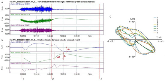 Typical seismic waveforms produced by a cargo train: (a) original waveforms; (b) waveforms after lowpass filter 0.1 Hz. 1–2—passing train, 2–3—subgrade relaxation. Vertical lines are timestamps for (1) train head and (2) train tail passage. The period Δt is a lateral relaxation time of the subgrade-ground system. After train passage: AX—minimum amplitude in the longitudinal railway direction; AY—maximum amplitude in the transverse railway direction. (c) Diagrams of the subgrade movement at the seismometer installation site in the horizontal plane during the cargo train passages (lines 1–8).