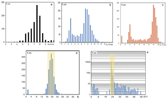 Histograms of the different parameters according to the results of processing for the entire period of observation: amplitude maximums: (a) AZ in first arrivals, (b) AX for component X, (c) AY for component Y, (d) Δt, and (e) parameter R.