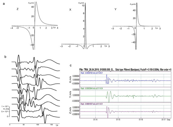 For the vertical component, the experimental and calculated waveforms were similar, and the amplitude values corresponded to the observations of 2017 in dry August AZ ~ 10–70 μm/s (Figure 4b). In 2019, the median value was <AZ> = 7.5 μm/s and according to (1), indicates a higher value of the μ. This result is realistic, given the difference between heated and frozen soil [47]. For horizontal components, the oscillations were a higher frequency compared to , based on the waveform visual assessment. Comparison with experimental waveforms, obtained by bandpass filter 0.1–0.5 Hz, agreed with the theory on the prevailing frequencies of the component waveforms, but did not have good agreement with the experiment on signal levels, especially for the -component.