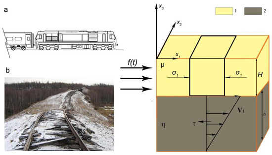 The stress disturbances transfer created by the train in the subgrade in horizontal direction: (a) geometry of the subgrade-ground system and perturbation of its stress–strain by passing train, 1—subgrade, 2—ground (boulder loam); (b) photo of the resulting effect on the railway (Railway track and track facilities. Available online: https://rzd-puteetz.ru/deformatsiya-osnovnoj-ploshhadki (accessed on 10 December 2021)).