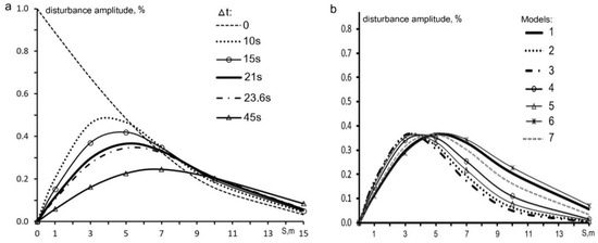 The disturbance amplitude value and the position of its curve maximum depend on the shear modulus of the upper layer and the viscosity of the lower layer. Figure 6 shows the results of calculations of the disturbance amplitudes depending on the distance from the railway, therefore, the movement of the curve maximum with distance from the railway is clearly visible. Different curves correspond to the times when the amplitude reached the maximum after the train passage, in our case, this was parameter . The disturbance amplitude reached a maximum at about 21 s (Figure 6a) after the train passing at a distance of 5 m (the sensor installation site); the maximum experimental velocity maximum occurred at 23.6 s. The calculation coincided well with the experiment (see Table 1). At the same time, the greater the value of , the smaller the disturbance amplitude. Table 2 contains the values of the soil parameters that we set for modeling, and Figure 6b shows the results. Thus, when the properties of the soils (shear modulus or viscosity coefficient) change, changes in the maximum values of disturbance amplitudes are observed.