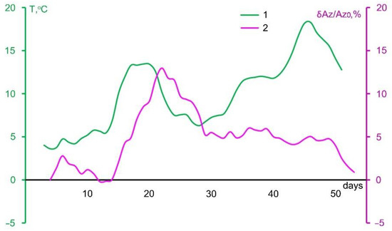 Evolution of amplitude AZ fluctuations and average daily value air temperature T during the experimental session from 23 April to 15 June 2019: 1—temperature, 2—δAZ/AZ0.