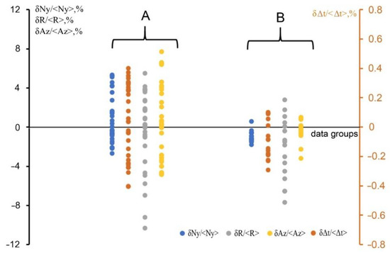fluctuations from the mean value for the entire monitoring interval were calculated using daily averaging and weekly smoothing ( in percent) [46]. The resulting fluctuation arrays were divided into two groups—before and after 30 days (Figure 8). Comparison of the variation of parameters for these groups shows that for , the scatter after thawing was much smaller than before it (i.e., when active changes occurred in the medium (thawing, watering, etc.)). Thus, these parameters are suitable for soil condition monitoring. Fluctuations for the two groups were comparable, however, to understand its sensitivity and suitability for automated monitoring, longer observations are required.