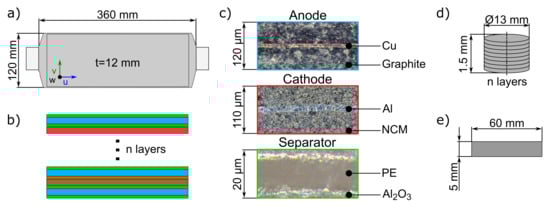 All investigations in this paper were performed on a state-of-the-art lithium-ion pouch cell with a capacity of 74 Ah. Figure 1 shows the geometry and structure of the cell as well as microscopic analysis and samples used for tensile and compression tests for each cell layer. In order to allow the distinct description of loading directions in the results section, a cell-related coordinate system (u, v, w) was introduced. The coordinate u describes the direction along the cell length, v the cell width, and w the thickness direction. The cell consists of several anodes, cathodes, and one folded separator between the active layers to prevent a short circuit. A 110 m thick cathode material consisting of one aluminum sheet and a LiNiMnCoO (NCM) double-coated layer is used. The anode material is a two-side carbon-coated layer on a copper current collector with a thickness of 120 m. The cell’s separator consists of polyethylene with a ceramic layer based on AlO. Its thickness is about 20 m. A detailed description of the manufacturing process for the test specimens, shown in Figure 1d,e, can be found in Section 2.5.