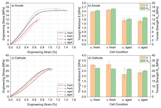 Mechanical test results under tension for fresh and electrically aged anode (Cu–graphite) and cathode (Al–NCM) materials in different cell directions: (a) Shows the anode’s stress–strain curves and (b) the anode’s Young’s modulus and tensile strength. Analogously, the results of the cathode are shown in (c,d).