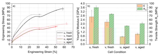 As mentioned before, besides the aging effects, the mechanical anisotropic behavior was also investigated by analyzing the u and v direction of the cell. By considering the indicated error bar of the curves, it can be seen that a low difference of 5% can be observed at the maximum stress values for the fresh anode material in both directions. The aged anode shows very similar behavior, indicating a low anisotropy as well. Wang et al. [26] concluded this behavior for fresh anodes. Comparing the two-side-coated aluminum collector with NCM in Figure 3c,d with the anode, a lower influence of electrical aging on the mechanical behavior of the cathode can be determined. The fresh and aged stress–strain curves show a very similar characteristic tensile strength and failure strain. An 8% lower tensile strength is observed for the aged cathode in the v direction. The Young’s modulus shows a lower mean value for the aged material of 20% in the u direction. In this case, it has to be mentioned that there is a wide statistical spread, which has to be taken into account and therefore indicates a low aging effect on the mechanical behavior of the cell’s cathode material. This behavior was also noticed by Liu et al. [33]. Considering the direction-dependent properties, the NCM–aluminum cathode can be described as an isotropic material. This cathode behavior is different compared to the mentioned anisotropic behavior of lithium nickel cobalt aluminum oxide (NCA) in the work of Wang et al. [26]. A different Young’s modulus of about 44%, depending on the cell direction, was observed under tension [26].