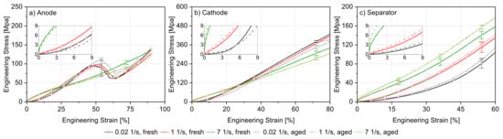 Comparison of compression test results of fresh and aged cell components considering different strain rates: (a) anode, (b) cathode, and (c) separator.
