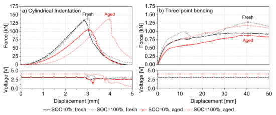 After analyzing the test results on cell component level, the test results of the whole lithium-ion pouch cells are presented. Figure 6 visualizes the fresh and aged cells’ force–displacement curves for (a) cylindrical indentation and (b) three-point bending at 0% SOC and 100% SOC. The voltage vs. displacement is also illustrated to show the point of occurring ISC based on a voltage drop. Through analyzing the test results in Figure 6a, a simultaneous force and voltage drop under cylindrical indentation can be noticed, which indicates a direct correlation between mechanical cell failure and occurring ISC. This correlation was already described in different studies [52,53]. Furthermore, a high influence of electrical aging on the mechanical properties at cell level can be mentioned. Considering the test results of the anode material under compression in Section 3.1, a similar influence on the mechanical properties by electrical aging can be noticed. The aged cells show a softer mechanical response indicated by a right-shifted force–displacement curve, which was also noticed in the work of Kovachev et al. [32] for pouch cells. In addition, the mechanical behavior of aged cells shows a higher dependence on the investigated SOC levels compared to fresh cells. While fresh cells have a different maximum force of up to 4% depending on their SOC, the aged cells at 0% SOC show a lower maximum force of about 30% compared to the fully charged condition. That also represents a 29% lower force compared to fresh cells for 0% SOC, which is a different behavior compared to the literature [32,33]. In both studies, a higher failure force for aged cells was observed at 0% SOC. Furthermore, the spread of failure displacement for fresh cells in contrast to aged cells dependent on their SOC is very low. Another aspect which has to be taken into account is the different voltage drop after occurring ISC between fresh and aged cells. For both SOC conditions, aged cells show a stronger voltage drop after cell failure.
