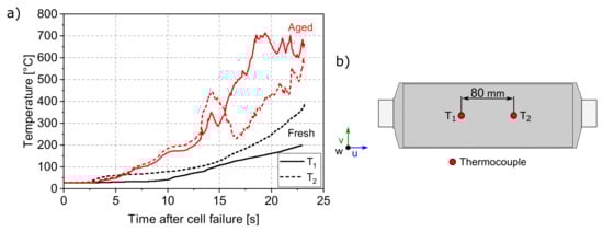 In order to compare fresh and aged cells with a focus on safety behavior in crash situations, it is not only the mechanical behavior that must be taken into account. In addition, the temperature evaluation after ISC can be used to investigate potential risks caused by TR. As already announced, two thermocouples (T, T) were installed on the cell surface at a distance of 80 mm for 100% SOC cylindrical indentation tests, as shown in Figure 7b. Additionally, Figure 7a illustrates the average temperature increase for each thermocouple after cell failure and ISC (t = 0 s), which indicates a TR. The observed cell behavior can be categorized in four stages. First, the ISC occurs, followed by the formation of smoke at 2 s. In a next step, at 5 s after ISC, a bloating of the cell can be noticed through gas exposition. In the last step, the pouch foil mechanically fails, which leads to a strong exothermic reaction and, as a result, to fire.