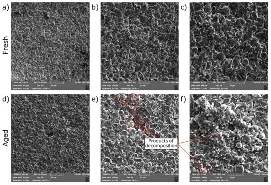 SEM analysis of the fresh (a–c) and aged (d–f) anode surface at different magnifications. The aged anode surface shows, in several places, products of decomposition due to electrical aging.