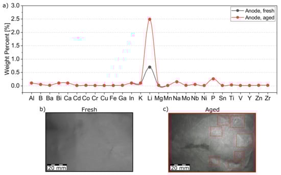 Figure 9a shows the anode’s results of ICP-OES analyses and Figure 9b,c of the visual inspection. Neither optical inspection nor ICP-OES analysis revealed any unexpected changes for the cathode material, which is why they are not shown in this section. For a review of the cathode’s ICP-OES results, the reader is referred to the Appendix A Figure A1.