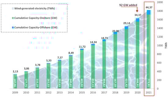 Sustainable development is a major goal of worldwide policy [1]. Moreover, a sustainable world addresses renewable-energy-source integration into different sectors, leaving behind fossil-fuel energy sources, such as oil [2], coal [3], and gasoline [4], and decreasing large emissions [5,6]. Among the different renewables, wind energy is considered one of the strongest and most profitable resources [7,8,9]. The evolution of the global wind sector is upward, in the new MW added to the total capacity as electrical energy generated from wind-power plants. The onshore wind capacity has increased by 298%, adding approximately 530 GW in the 2010–2020 period. A total of 32 GW has joined the total offshore capacity during this same period. The global accumulated wind capacity in 2020, including both technologies (on- and offshore), accounts for 743 GW—a 14% growth over the previous year. The new facilities exceed 92 GW, being the annual electricity generated close to 1648 TWh (see Figure 1) [10]. Previous wind-energy-evolution data analysis can be found in [11].
