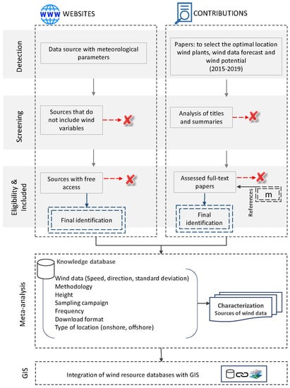 Systematic review: The objective of this stage was to identify the wind data sources in two ways: (i) Directly on the web and (ii) through the contributions by means of identifying such wind data sources used by researchers in their work methodologies for wind-data forecasting studies, wind-resource-potential discussion, or wind site optimization. Both pathways were grouped into the following steps: Detection, screening, and eligibility, and they were included. First, data sources were identified with meteorological variables using the Google search engine. Subsequently, sources that did not include wind variables were discarded. Sources providing free access to wind data were included in this study as well. The contribution databases used were the following: Google Scholar, ScienceDirect, SCOPUS, and Web of Science. From the keywords of the objectives derived from the analyzed topic, all relevant contributions were initially identified. Subsequently, from the contributions related to the specific problem, duplicate records and unrelated works were discarded, identifying the group of potential contributions. The full text of these selected works was then reviewed, discarding such reviews and/or works not directly related to the wind resource. Finally, the selected contributions to the study were considered for analysis purposes.