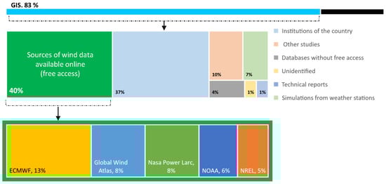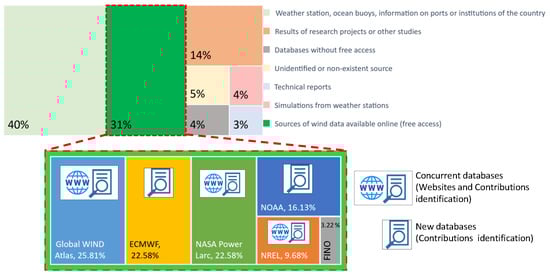 From the keywords of the objectives derived from the searching of contributions, a total of 3133 works were identified. After a first analysis, 375 potential contributions were selected, and 2758 were discarded due to duplicate records and/or external works. The full text of the selected works was reviewed, discarding such reviews and studies not directly related to wind resources. Finally, 97 contributions were included in the study, while 284 were discarded, and six contributions from other references were added. In summary, 40% of the works used wind data sources from meteorological stations, ocean buoys, and information from ports and institutions in the country of the study case; 31% of researchers used wind data sources online with free access at a global or a continental level. The databases for both identifications were: Global Wind Atlas, NREL, FINO, and NASA Power Larc, accounting for 18%. During the contribution analysis, two new databases were added to the results: ECMWF and NOAA (see Figure 3. The wind data sources found by both methods are summarized in Table 2.