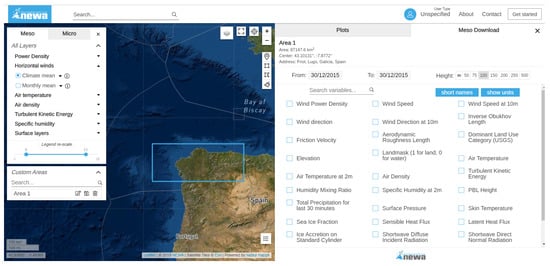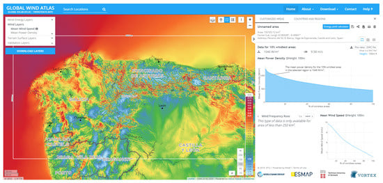 New European Wind Atlas: Uses a mesoscale and microscale model combining large-scale atmospheric simulations (mesoscale) with topography models (microscale) [115]. From these models, the wind-resource potential was analyzed in large regions with high precision [139], reducing the time cost required to establish wind-power plant areas. The dataset has 30 years (1989–2018) of mesoscale simulations with the Weather, Research, and Forecasting (WRF) model at a 3 km2 resolution [140]. With regard to the data download options, only the mesoscale model data are able to be downloaded. The following heights are available: