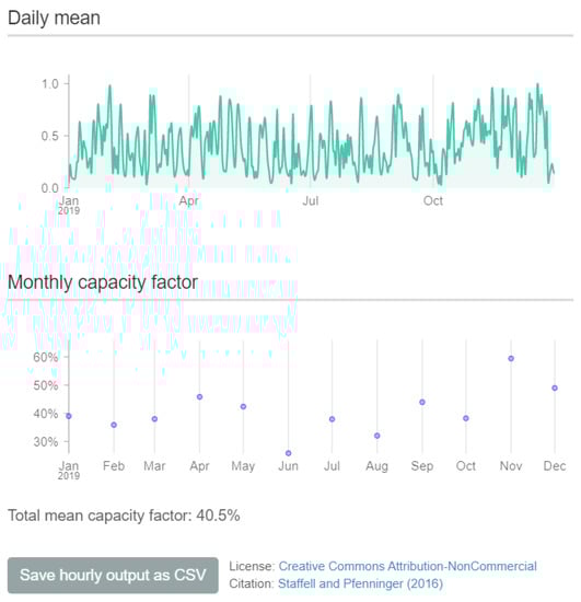 Renewables Ninja: Simulates energy production per hour in wind-power plants based on coordinates. The main source data come from satellite observations, using NASA MERRA. Wind speeds are turned into power using the ’Virtual Wind Farm’ (VWF) model [142]. The meteorological information includes data between a height of 10 and 150 m. Registered users are able to access full information collected between 2000 and 2018. Anonymous users have access from 2014 to 2019 [117]. A simulation program, with a wind-turbine database, is also available for users. This software simulates the power generated by a turbine. Figure 6 shows the simulation of a 1 kW model turbine in 2019.