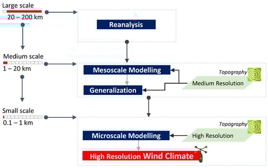 Global Wind Atlas (GWA): The result of a partnership between the World Bank Group, funded by the Energy Sector Management Assistance Program (ESMAP) [143], and the Department of Wind Energy at the Technical University of Denmark (DTU, Wind Energy) [144]. All data provided by Global Wind Atlas [119] are validated and based on a wind-atlas methodology and the Wind Atlas Analysis and Application Program (WAsP). GWA uses a down-scaling process. Large-scale wind climate data are provided by atmospheric reanalysis, and 30 km data are input into a WRF mesoscale model using a 3 km spacing. These wind data are applied to a microscale model, made up of a WAsP based on estimations every 250 m at heights of 10, 50, 100, 150, and 200 m. Figure 7 shows the GWA down-scaling methodology [119]: