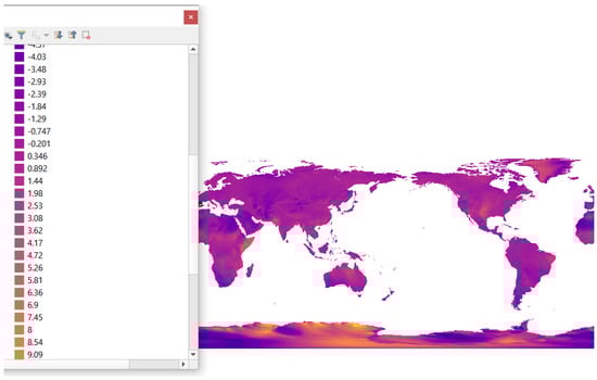 ECMWF: Wind speed (in m/s) can be downloaded, for a height of 10 m, in u-component (speed from west (−) to east (+)) and v-component (speed from south (−) to north (+)). The downloaded information is available worldwide. In Figure 11, the wind speed in the v-component is represented by the QGIS tool. The negative wind speed v-component is represented by the QGIS tool. The negative wind speed v-component represents the south direction, and the positive wind speed represents the north direction.