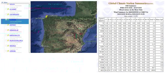 NOAA: The parameters are available worldwide, as NOAA has access to weather stations around the world [138]. The sky cover, sea level pressure, temperature, dew point, etc. are available to be downloaded, but only wind speed/direction data are used by considering our proposals. The information cannot be represented in QGIS, since the downloaded format is .csv. However, wind speed is classified by direction, suitable for determining the compass rose and the wind frequencies in a specific area—at the weather-station height. As an example, Figure 12 shows the classified wind speed for the A Coruña 08002099999 meteorological station, located at A Coruña airport (Spain), at a height of 98.45 m.
