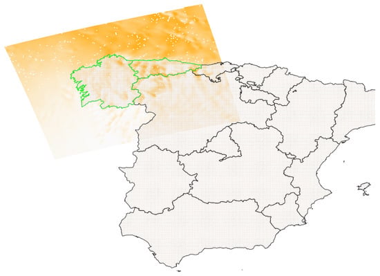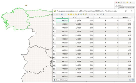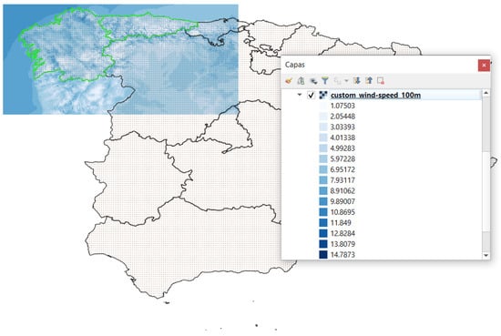 Global Wind Atlas: The methodology used by the Global Wind Atlas provides interesting parameters on weather; however, the only parameter compatible with GIS tools is wind speed. Data are downloaded using coordinates or drawing a rectangle on the map, covering a certain area or even a country [119]. Figure 15 shows an example of downloaded data for two Spanish regions (Galicia and Asturias), covering an area of approximately 15,000 km2. The raster layer format can be downloaded as well. Classifying the parameters by their values, a 100 m height wind speed in Galicia and Asturias Spanish regions can be represented in QGIS (see Figure 16).