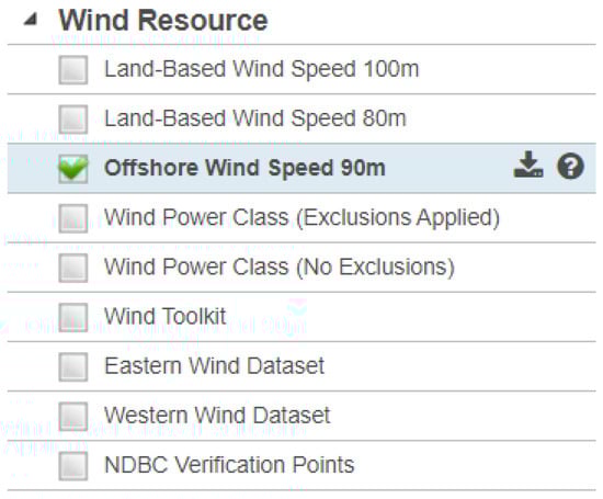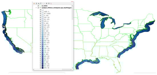 NREL: This website only has data from U.S. open-access information about the wind-speed module, and the direction at a 90 m height is available for offshore parameters (see Figure 17) or between a height of 10 and 200 m for onshore wind-power plants [124]. Data can be downloaded in .csv format or as a .shp layer file. In this way, the .csv files can be used for mathematical purposes and .shp files to represent maps in QGIS tool. Figure 18 represents graphics in QGIS, showing the wind speed in 0.5 m/s ranges.