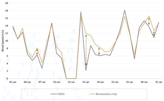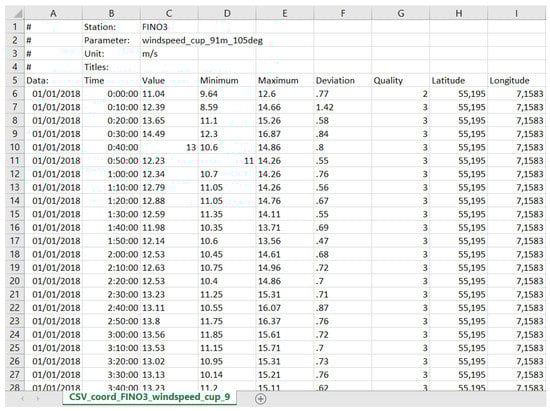 FiNO3 Platform: This platform works for the North and Baltic Sea. Wind speed and direction are measured between a height of 34 and 91 m, due to the measurement system’s location along the entire platform [128]. The parameters are downloaded in .dat format, needing to be converted into .csv files to be used in QGIS (Figure 19). As Renewables.ninja information, it is not easy to represent the obtained results in GIS, since they are limited in terms of being downloaded for a specific location.