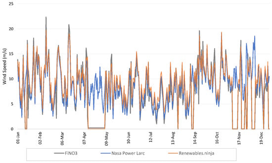FiNO3 Platform: The FINO company has three platforms located along the North and Baltic Sea. For this work, we only had access to the third platform (FiNO3) built in 2009 (see Figure 9) [128]. It only provides information regarding such coasts, being an example to be followed by the rest of the information sources, as it provides sea-wind data in real time. FiNO3 is thus suitable for wind-energy research projects and offshore wind-site optimal locations. A relevant drawback of measuring meteorological variables at an offshore-specific site is meteorological mast maintenance, in comparison to an onshore site, including sensor and equipment maintenance over a long time period. Anemometers and other tools should be calibrated periodically, since their efficiency decreases drastically through time and sensor signal distortion [145]. FiNO3’s available heights are: 34, 42, 51, 62, 71, 82, and 91 m, including both direction and wind-speed data. Additional parameters are also collected, such as air pressure, air temperature, global radiation, rainfall, and UV radiation. All parameters are available and accessible from 2005 to the current day, with a 10-min sample time.