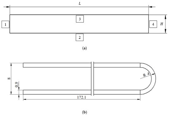 Investigated geometries. (a) Rectangular channel geometry. 1—moving left wall, 2—bottom wall, 3—top wall, 4—right wall, L—channel length, H—channel height. (b) Geometry of the Pt-100 thermometer filled with air, the dimensions are in mm. The 0.9 mm end walls are modelled as oscillatory boundary conditions with the frequency kHz.