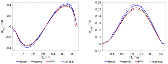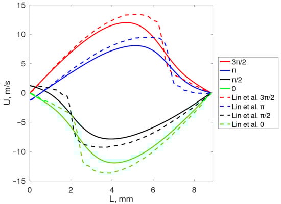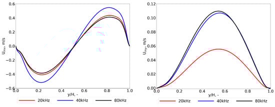 The Figure 2 shows changes of the x and y components of the streaming velocity and for various resolutions of the mesh (cases 1A, 1B, 1C from the Table 1) and their comparison with analogous results from []. To perform the mesh independence study, the number of mesh elements for case 1A was increased four times (mesh 1B) and sixteen times (mesh 1C). The comparative results obtained in Figure 2 show that the compatibility with the results [] is satisfactory for all meshes, but for further research, it was decided to choose the densest numerical mesh. It should be added that for higher frequencies and, consequently, different channel lengths and heights, the number of mesh elements was scaled relative to the 1C mesh.