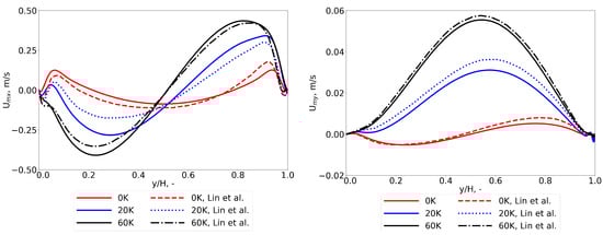 An important conclusion from the results in Figure 3 is that the streaming velocity increases with increasing temperature difference. The maximum values of are 0.127, 0.342, 0.436 m/s and are 0.00521, 0.0311, 0.0555 m/s for K, respectively.