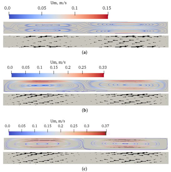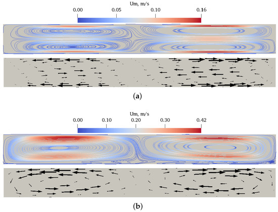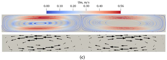 Moreover, it should be noted that the Figure 5a, Figure 6a and Figure 7a show the classic Rayleigh streaming due to the presence of a viscous boundary layer. In the event of a temperature difference between the upper and lower walls, a temperature gradient is established perpendicular to the pressure gradient and a strong baroclinicity is created. The baroclinic effect is included in the Helmholtz vorticity equation as the source term [], causing creation of vorticity in the interior of the flow. Consequently, an emerging streaming flow does not depend on the existence of the viscous boundary layer.