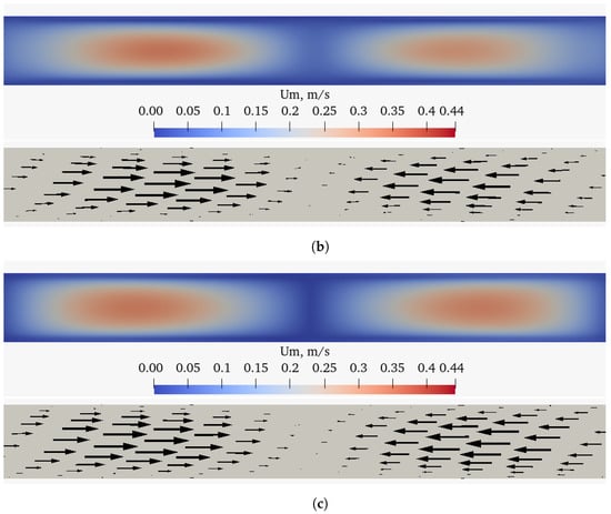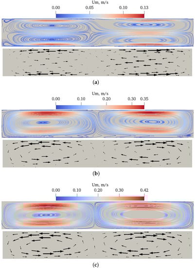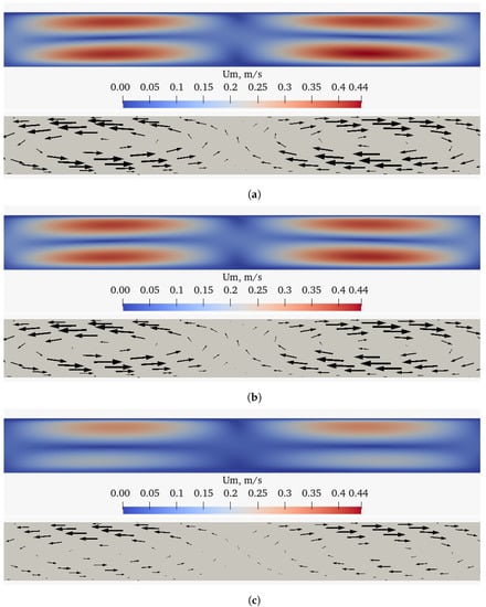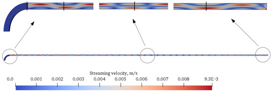 By examining the 2D cross-sections of the streaming (Figure 10a–c), it can be seen that the structure of the vortices is preserved, but their intensity decreases approaching the wall.