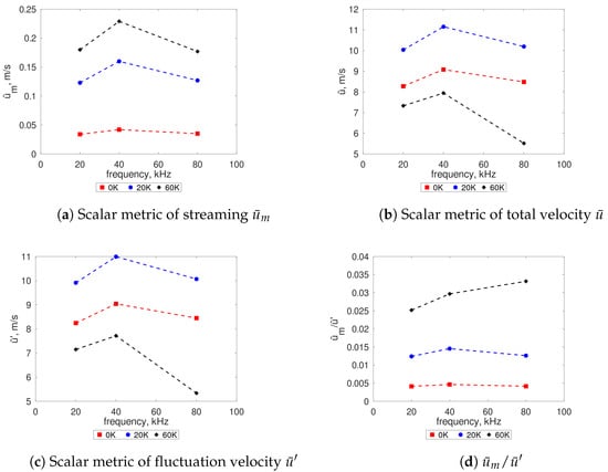 The analysis carried out in the work [] showed that the intensity of the streaming flow should not depend on the frequency of acoustic wave. The extensive parameter space included in the present research made it possible to refer to the above statement. The Figure 8 shows the changes of scalar metrics representing the total velocity , fluctuation velocity , streaming velocity , in the function of and frequencies f. The results in the Figure 8a show that the streaming flow is only slightly dependent on the frequency of the acoustic wave and increases with an increase in . Note that there is a slight maximum at 40 kHz.