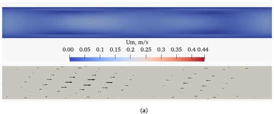 As in the definition (10) the scalar value of the typical fluctuation velocity was calculated. First, the ensemble mean of the total velocity field u was calculated by summing 10 velocity fields with maximum flow speeds. Then the scalar metric of the total velocity was calculated analogously to the Equation (10) and finally .