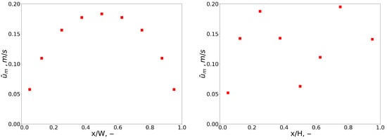 Figure 12 shows the scalar metric of the streaming flow calculated in each considered cross-section according to the Formula (10). On the left graph of the Figure 12 it is clearly visible that the streaming weakening towards the wall is not linear, but rather quadratic. It is worth adding that the scalar metric of the streaming intensity creates a quasi-parabolic profile along the width of the resonator.