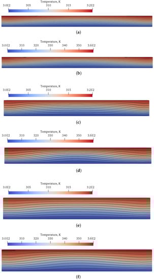 Mean temperature and isotherms for the non-isothermal cases. (a) Case 1B*, 20 K, 20 kHz. (b) Case 1C*, 60 K, 20 kHz. (c) Case 2B 20 K, 40 kHz. (d) Case 2C 60 K, 40 kHz. (e) Case 3B, 20 K, 80 kHz. (f) Case 3C, 60 K, 80 kHz.