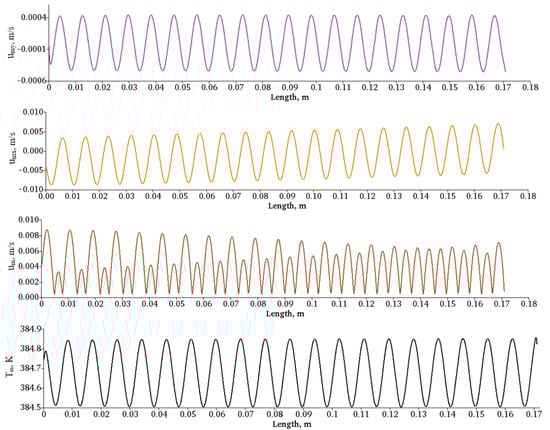 Figure 15 shows the changes of vertical component of the streaming velocity , horizontal component of the streaming velocity , the magnitude of streaming velocity , and the mean temperature along the thermometer channel taken at the height H. The graph presenting the course of the velocity shows that there are 20 pairs of counter-rotating vortices of similar strength along the channel. On the basis of the graphs showing the course of and , it can be noticed that the vortices rotating clockwise weaken as you move away from the oscillating wall, while anticlockwise vortices behave in the opposite way. It can be see that the peak velocity has changed from m/s to m/s.