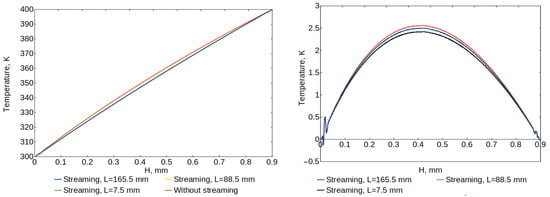 The Figure 16 shows the cycle-averaged temperature profiles established in the thermometer channel at 3 different locations mm and compares it with the flow without streaming. To better illustrate the differences between the flow with and without streaming at the selected locations, the temperature differences between the temperature profiles of the flow with and without streaming are also shown (left graph of the Figure 16). It can be observed that the greatest difference, slightly above 2.5 K, occurs at mm (near the oscillating wall), and the smallest difference, still above 2 K, occurs at the center of the channel mm. Interestingly, the temperature difference starts to increase again as moving away from the center of the channel and is larger at mm than at mm. Moreover, the maximum temperature difference is approximately halfway up the channel height for all considered locations.