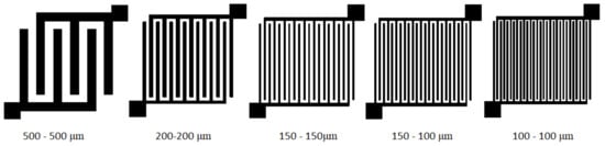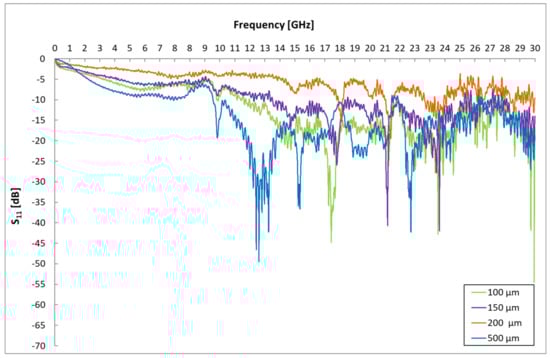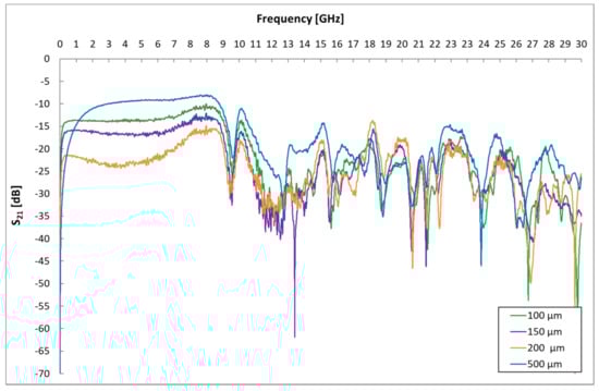 In the first phase, the influence of geometric dimensions, i.e., different distances of interdigital electrodes, on the signal response was determined. Sensors with electrode spacings of 500 µm, 200 µm, 150 µm and 100 µm were created and tested. The resulting measured frequency dependences of the scattering parameters are shown in