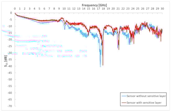 8]. Based on these measurements, changes in the transmitted and reflected signals caused by a change in impedance under the action of different gases were searched. However, commonly used impedance spectroscopy is used in sensors only in the range of a few megahertz. At these frequencies, the frequency response of the sensor may not change with different analytes. Changes in the frequency response start to appear in the gigahertz band; therefore, the scattering parameters are used to detect gases instead of impedance.