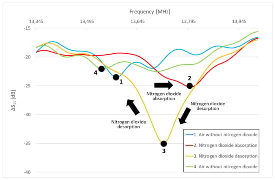 2 is characterized by a change in the resonant frequency (shift from point 1 to points 2 and 3) and a difference in the amplitude of the scattering parameter at a given resonant frequency. To detect a certain gas, resonance at a particular frequency is crucial to identify. Resonance causes a change in the amplitude values of the scattering parameters. Generally, during the action of NO