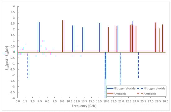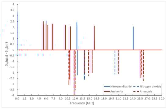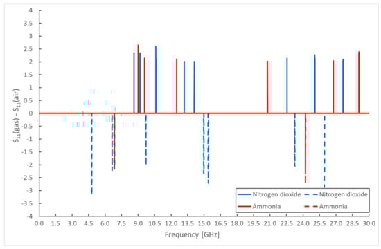 Figure 10. These figures show the most significant differences in the scattering parameters in the frequency spectrum (signal attenuation or transmission), obtained as the difference between the measured scattering parameters of sensors located in the gas chamber with continuous NO