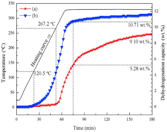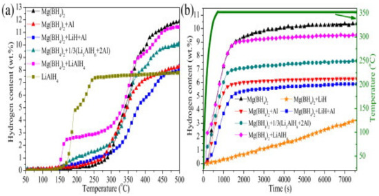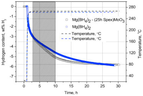 Saldan et al. [120] studied the reversible H2 desorption–adsorption of γ-Mg(BH4)2 ball-milled with MoO3 and TiO2. As can be seen from Figure 5, γ-Mg(BH4)2–MoO3 first desorbed H2 at 267 °C, which released approximately 5.1 and 5.6 wt% of H2 after 10 and 15 h, respectively. At a slightly lower temperature, pristine γ-Mg(BH4)2 released about ~4.6 and about ~5.2 wt% of H2 at the same time.