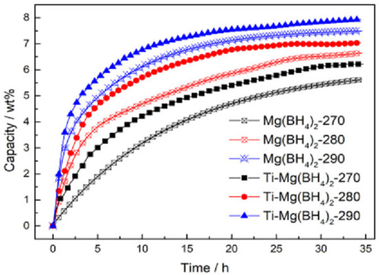 Recently, Wang et al. [115] investigated the influence of Ti nanoparticles on the dehydrogenation kinetic and reversibility of Mg(BH4)2, and found that the Ti-doped Mg(BH4)2 sample showed better desorption kinetics than the undoped Mg(BH4)2. The Ti-doped Mg(BH4)2 sample also showed a great improvement in terms of capacity released, in which at 270, 280, and 290 °C, as shown in Figure 3, the doped sample could desorb more H2 within 35 h than Mg(BH4)2 does for each temperature. Moreover, the activation energy for hydrogen release from Mg(BH4)2 also decreased after the addition of Ti nanoparticles. Based on the Arrhenius plot, the activation for Ti–doped Mg(BH4)2 sample was 56.5 kJ/mol, which was lower than that of undoped Mg(BH4)2 (61.1 kJ/mol). From the experimental results, Wang et al. concluded that during the milling and heating process, Ti nanoparticles react with Mg(BH4)2 to generate in situ Ti-based species (TiH1.924 and TiB2). It is believed that TiB2 could act as a heterogeneous nucleation agent, and TiH1.924 could act as a hydrogen pump during the rehydrogenation process. Table 4 presents the effect of several metal catalysts on the desorption and absorption of Mg(BH4)2.