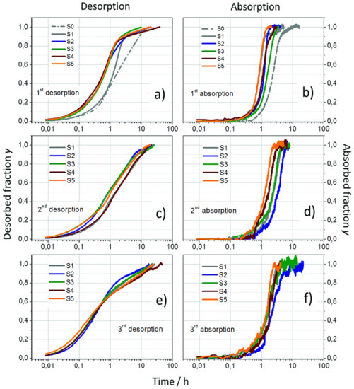 Isothermal desorption kinetics (a,c,e) and absorption kinetics (b,d,f) of different sample S0–S5 during 3 cycles. γ-Mg(BH4)2 as received (S0), γ-Mg(BH4)2 ball-milled (S1), and γ-Mg(BH4)2 + 2 mol% X (X = CoF3 (S2), Co2B (S3), CoCl2 (S4), Co3O4 (S5)) [118].