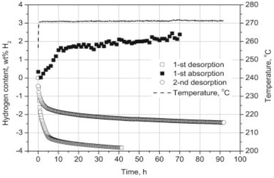 Cycling properties of hydrogen sorption of γ-Mg(BH4)2 + 2 mol % TiO2 [120].