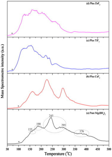 Temperature desorption curves for (a) pristine Mg(BH4)2 and fluoride-doped Mg(BH4)2: (b) CaF2; (c) TiF3 and (d) ZnF2 [128].