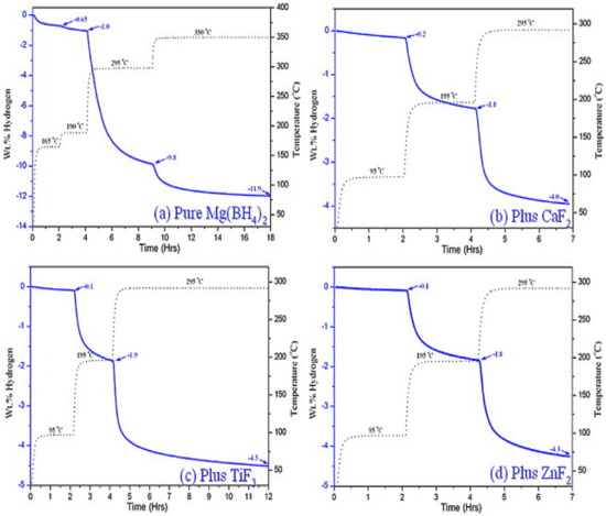 Hydrogen desorption profiles for (a) pristine Mg(BH4)2 and fluoride-doped Mg(BH4)2: (b) CaF2; (c) TiF3 and (d) ZnF2 [128].