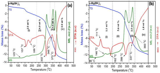 TG-DTA-MS measurements of (a) as-milled pure Mg(BH4)2, and (b) as-milled ZrCl4-catalyzed Mg(BH4)2 [129].